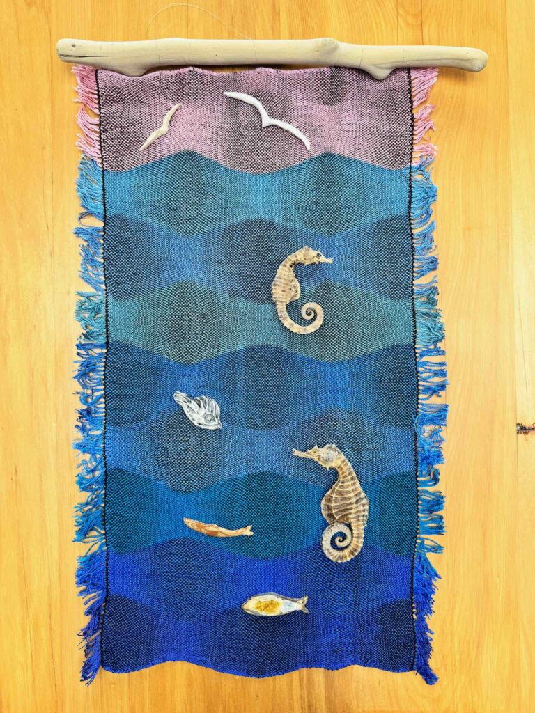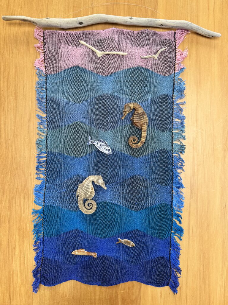 My idea for two of these pieces of fabric was to create wall-hangings with them. A friend had given me four dried seahorses taken from fishing nets years ago and another friend gave me several small fish and seagulls that she had made from clay. The woven fabric was to be the sea for these objects.