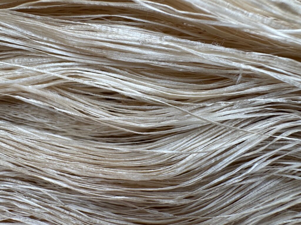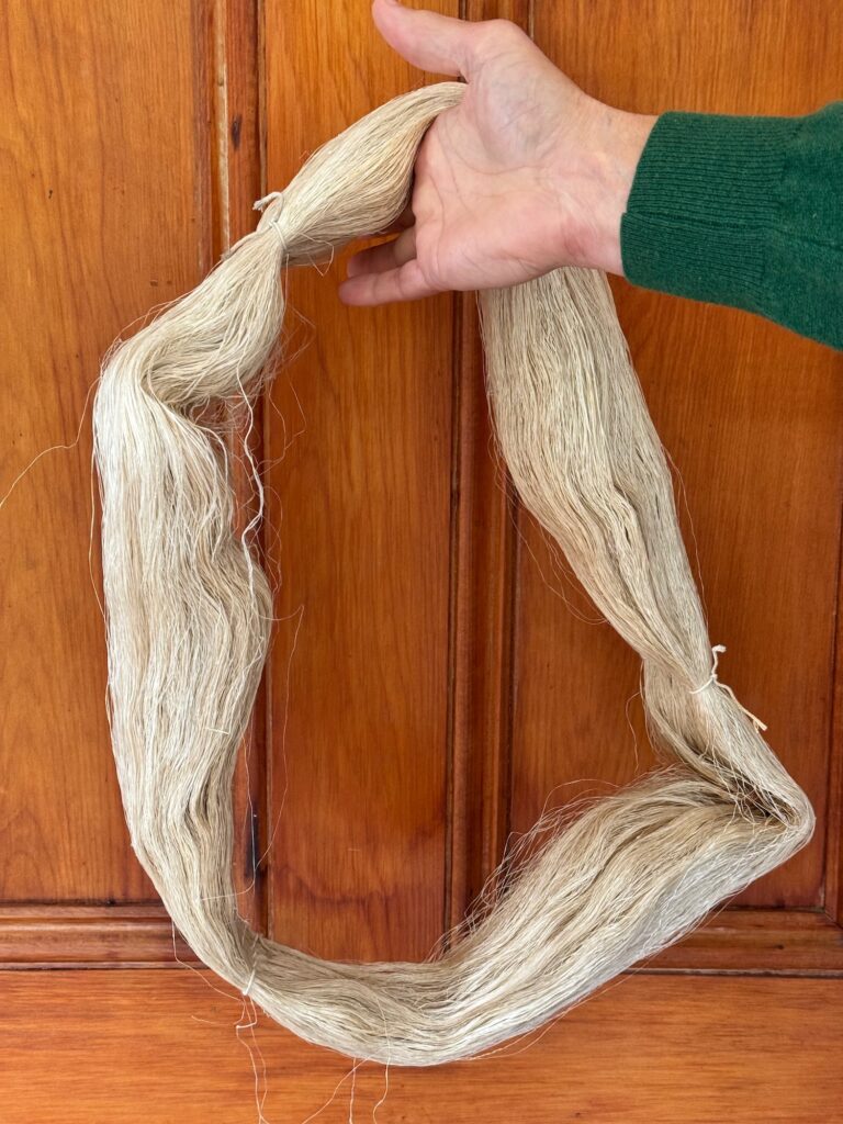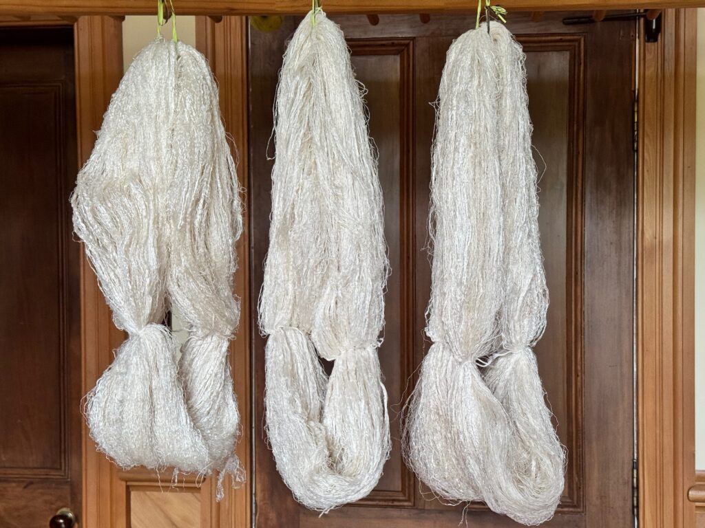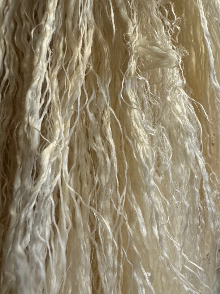 This yarn was quite “wiry” and “springy” (see image below). In order to be dyed and woven, the sericin needs to be removed.