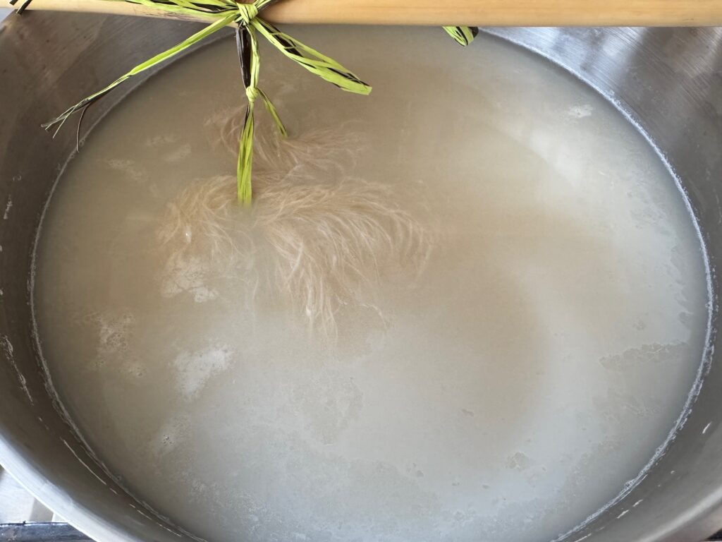 – I doubled a skein over and tied a loose loop of string through the doubled skein. I then inserted a stick through the string loop and balanced the stick across the top of the pot. This meant that the skein was largely kept off the bottom of the pot while being heated. In order to reduce tangling and also to allow good movement of the water in the pot, I treated a single skein per pot.