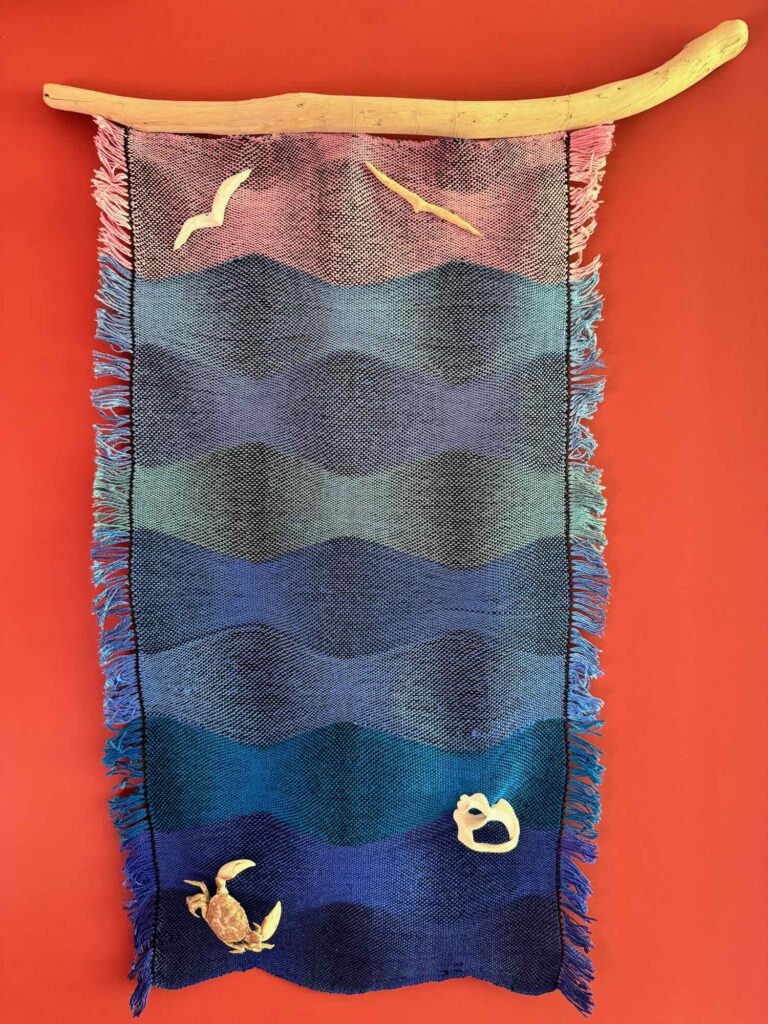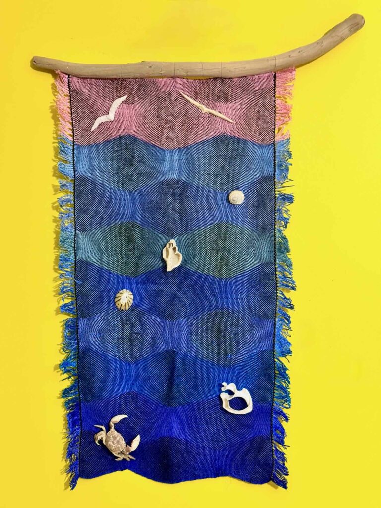 As for the earlier two wall hangings from this warp, I found a driftwood stick of an appropriate size and shape and, using thin fishing line, attached it to the top of the piece of fabric. Then, using the same fishing line, I sewed 1 crab, 4 shells and 2 ceramic seagulls onto the fabric. To do this, I threaded the fishing line through the fabric, around the object, back through the fabric and tied a knot – each shell is held with one piece of fishing line, the seagulls with two.